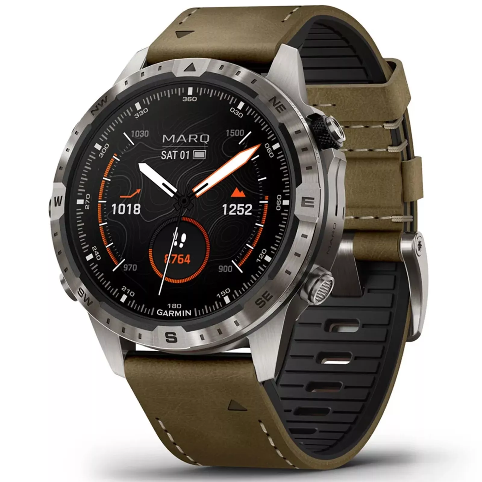 Built to make a statement, this luxury modern tool watch features a leather and FKM rubber hybrid strap, stunning AMOLED touchscreen display with traditional button controls and a 46 mm case made of Grade-5 titanium for an ultradurable design.